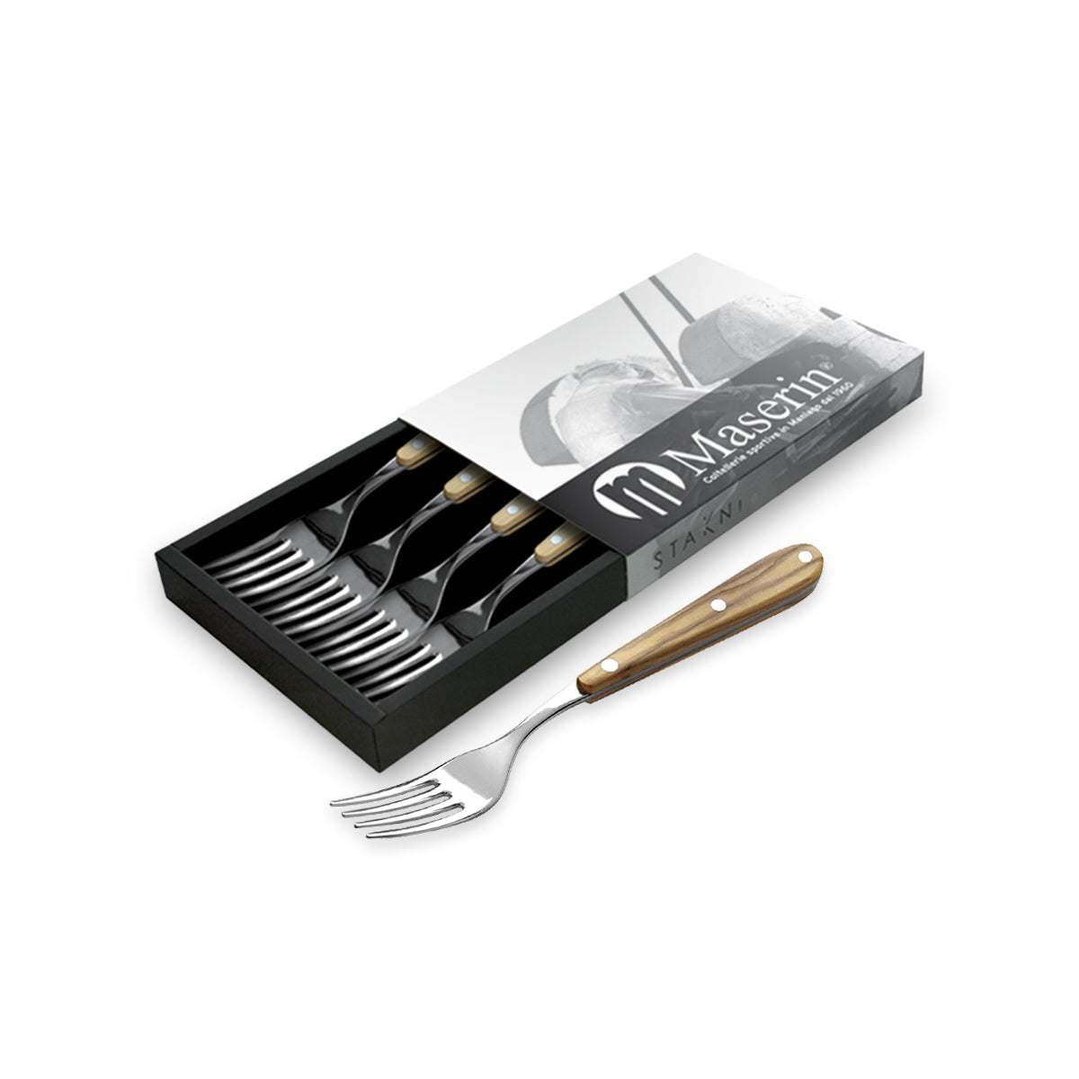 2051/OL è un set di 4 forchette con manico in legno di Olivo e corpo forchetta in acciaio con finitura lucida.